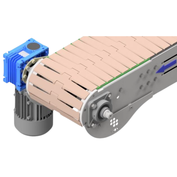 Transportador equipado con sistema de cadena de charnela para el transporte de productos mediante accionamiento motorizado, fabricado en acero inoxidable para aplicaciones que requieren higiene y resistencia.