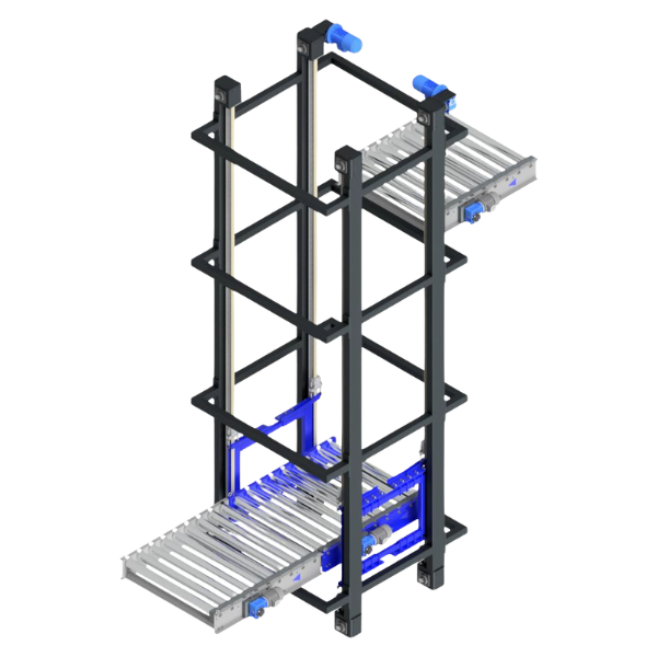 Sistema elevador de pallets con plataforma embarcada y sistema de seguridad anticaída, diseñado para el cambio de nivel en líneas de transporte automatizado.