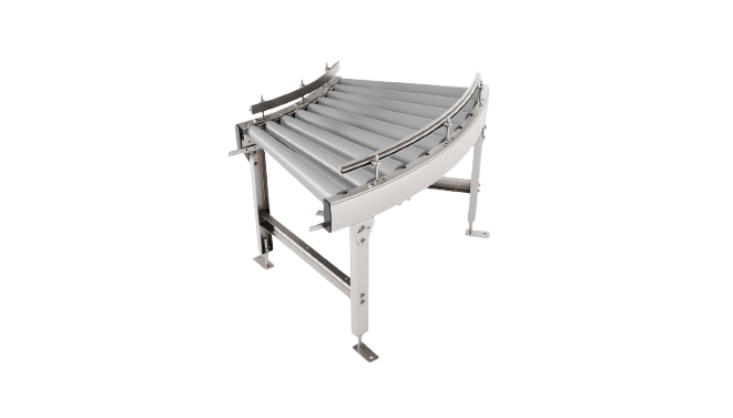 Transportador curvo de rodillos cónicos Poly-V accionado mediante Roller Driver a 24v o 48vDC para transporte o acumulación sin presión.