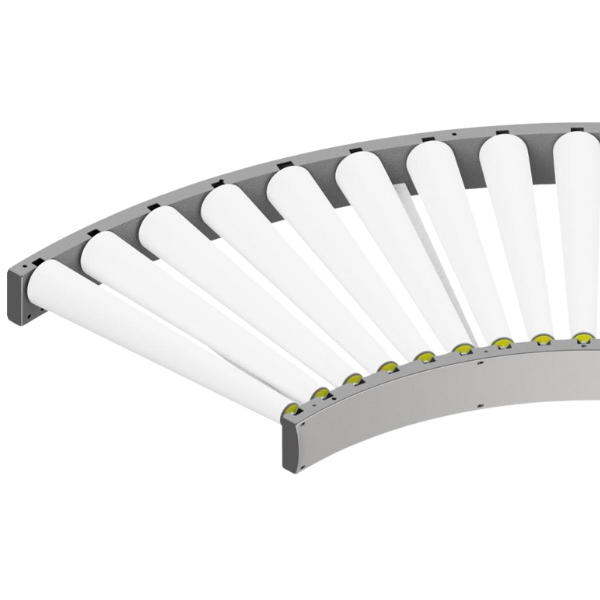 Transportador diseñado para el transporte de productos mediante accionamiento por gravedad. Equipado con rodillos cónicos que facilitan el movimiento en curva.