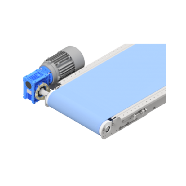 Sistema de transporte lineal con banda sintética motorizada, fabricado en acero inoxidable, ideal para el manejo de productos ligeros y medianos en líneas de producción, envasado y distribución. Equipado con motorreductor de alta eficiencia y rodillos de precisión que garantizan un movimiento suave y constante de la mercancía.